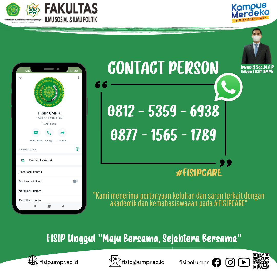 #FISIPCARE Masih bingung terkait perkuliahan? Ada masalah pendaftaran, pelaksanan perkuliahan, urusan akademik, dan kemahasiswaan lainnya? Atau, punya saran yang bisa membuat pelayanan lebih baik lagi? 🤔 FISIP UMPR dengan bangga mempersembahkan “FISIP CARE” Kami mengajak Mahasiswa, alumni dan masyarakat untuk mengirimkan pertanyaan, keluhan, atau saran terkait dengan akademik dan kemahasiswaan pada FISIPCARE. Kami juga mempersilakan...Read More