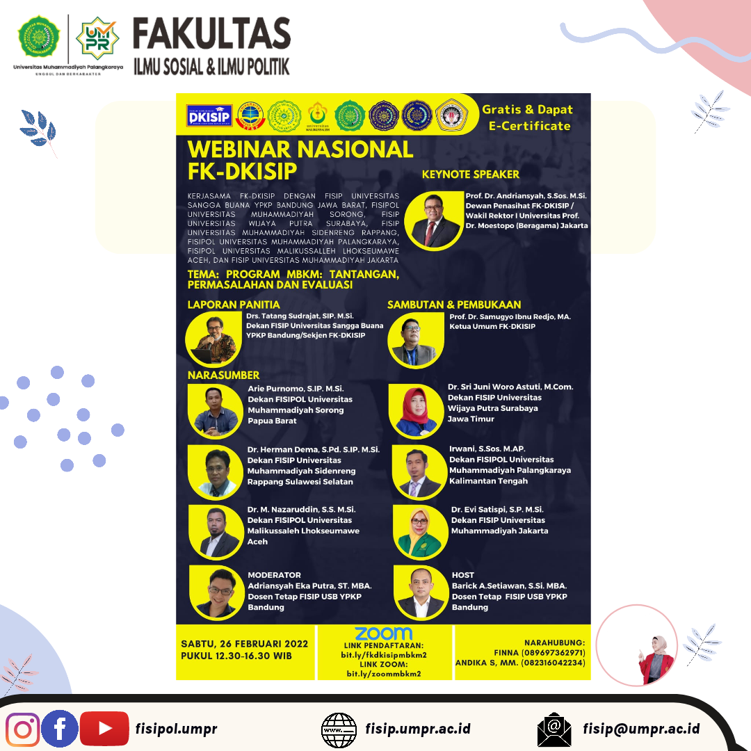 *WEBINAR NASIONAL FK-DKISIP* Tema: *”Program MBKM: Tantangan, permasalahan dan evaluasi”* yang akan diselenggarakan pada: 🗓️ Hari/Tanggal: SABTU, 26 FEBRUARI 2022 ⏰ PUKUL : 12.30-16.30 WIB Pembukaan oleh: ✅ Prof. Dr. Samugyo Ibnu Redjo, MA. (Ketua Umum FK-DKISIP) Keynote Speaker : ✅ Prof. Dr. Andriansyah, S.Sos. M.Si. (Dewan Penasihat FK-DKISIP / Wakil Rektor I Universitas Prof....Read More
