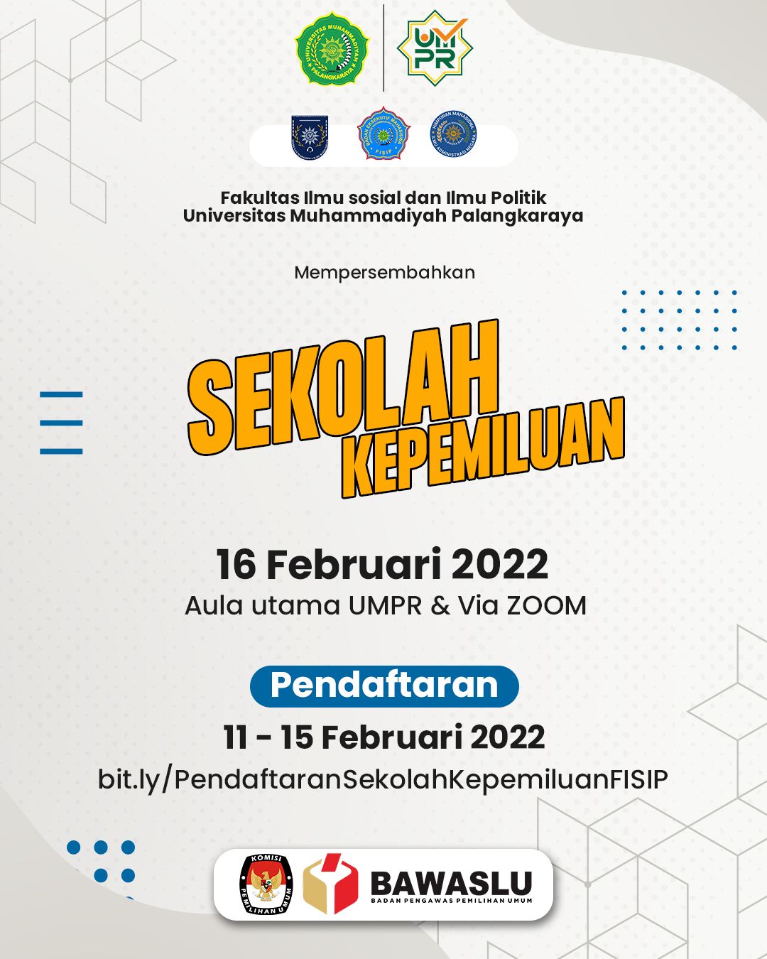 [SEKOLAH KEPEMILUAN] Sekolah kepemiluan merupakan implementasi dari perjanjian kerjasama antara KPU Kota Palangka Raya, Bawaslu Kota Palangka Raya dan FISIPOL UMPR. Dalam Sekolah Kepemiluan ini FISIPOL melaksanakan kegiatan yang mengaktifkan BEM & Hima FISIP UMPR. FISIP UMPR Bangga Hadir🎉 — SEKOLAH KEPEMILUAN MAHASISWA FISIP UMPR — Dengan Tema : “Terbinanya mahasiswa yang sadar akan pemahaman...Read More